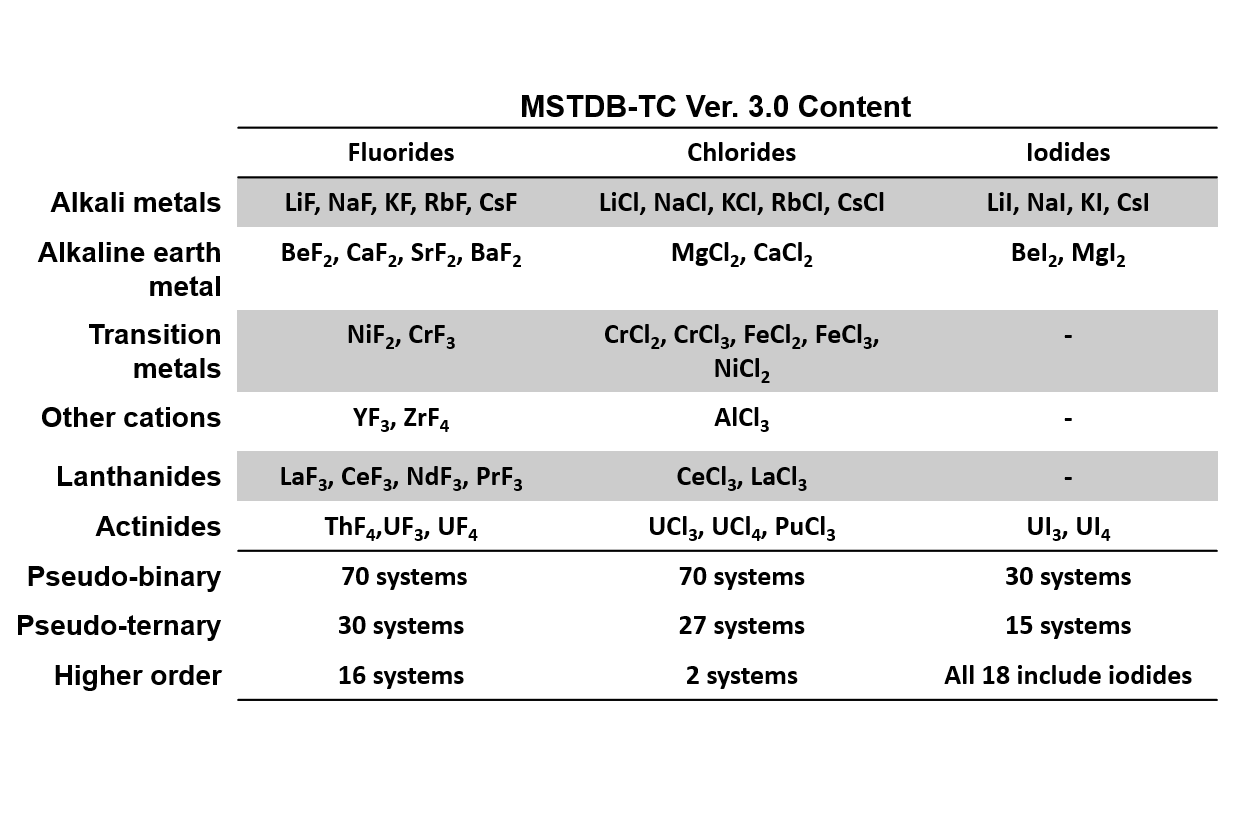 The Molten Salt Thermal Properties Database-Thermochemical (MSTDB-TC) Ver. 3.0 (succeeding Ver. 2.0) is now available for general use. Access procedures remain the same as for earlier versions.