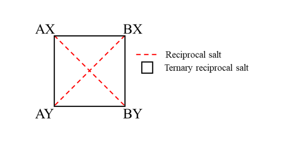 Version 3.1 is the first that includes multiple models of reciprocal salt systems, i.e., that in addition to multiple cations some systems have more than one anion. To explain the nomenclature, reciprocal systems are represented graphically as seen in the figure below. The square represents all four species of a system with two cations and two anions, and is referred to as a reciprocal salts, with the pairs connected by the diagonals are ternary reciprocal systems that can exchange anions and cations